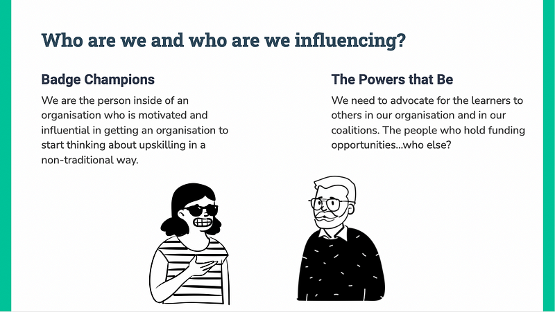 We have the authority to be assertive about badges. We are a community with people who have invented and pioneered badge systems, technologies, standards and everything else badges. People in this community are front line educators and learner advocates. We are the people who are motivated and influential in getting organisations to start thinking about upskilling in a non-traditional way.