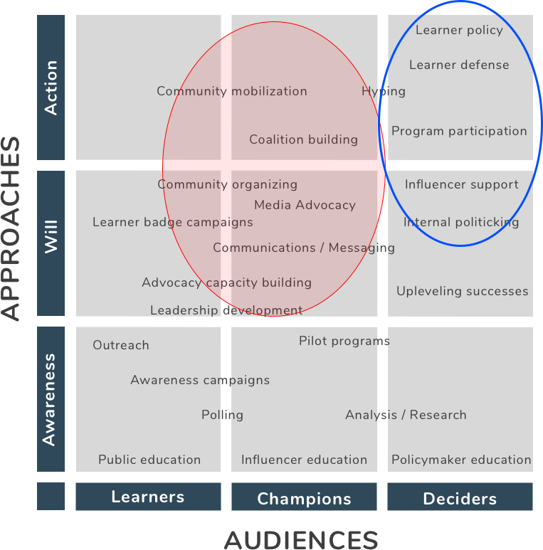 Using the framework, our community of Badge Champions are likely focused in the red zone. They need to advocate to people in the blue zone. Thus, our community might be supported with things like: