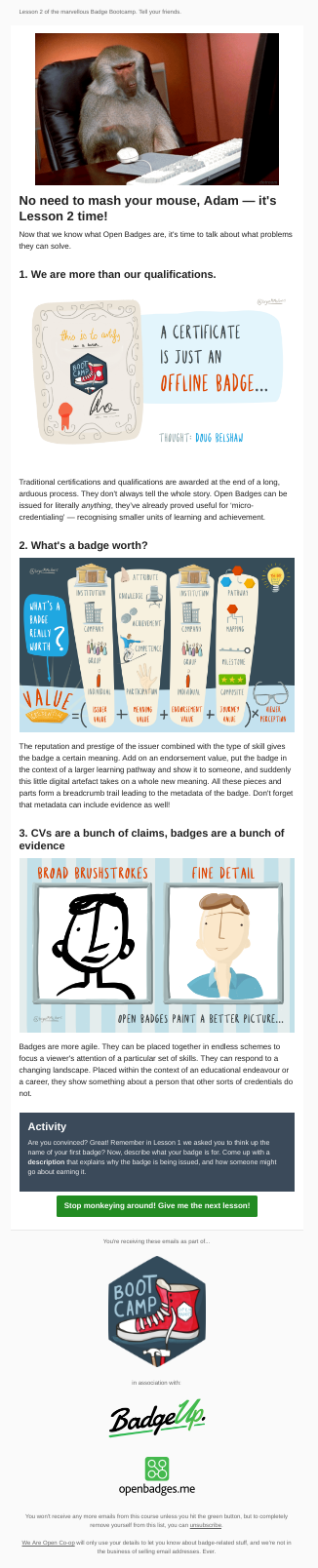 We wanted something fun and engaging, as there are so many boring, corporate ways of doing credentials. We also wanted something that provided information on-demand, and allowed individuals to receive a badge in recognition of creating their first one. For this reason, experimented with a self-paced email course. The idea was that the person signing-up should be able to go through it as quickly as they want to.