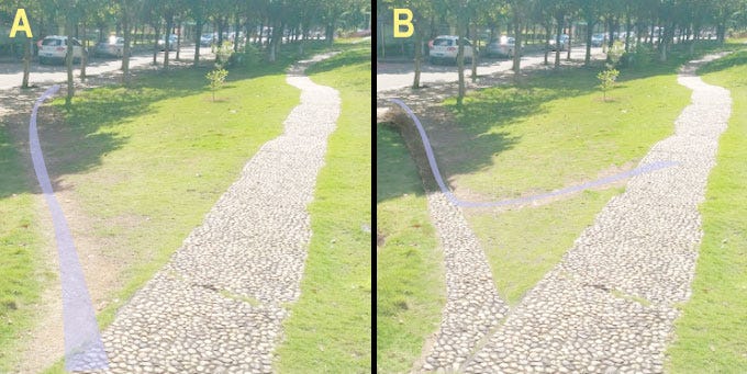So one solution is not to create any paths at all, but instead see where people actually walk. Then create a path over the top. In other words, paving the cow paths.