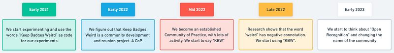 As we’ve explained in a previous post, we’ve been helping build a community around Open Recognition and Open Badges. This community was originally called ‘Keep Badges Weird’ but, more recently, we’ve settled on a more inclusive name: ‘Open Recognition is for Everybody’. Communities evolve and sometimes they need to be more comprehensive. This might require a new name and new brand. This post outlines how we went about this rebranding to prevent confusion and to ensure we took people with us as we made changes.