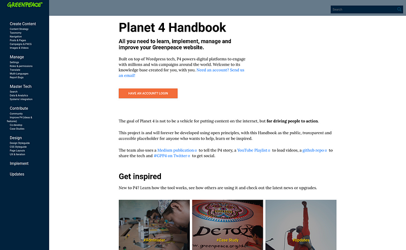 The landing page of any documentation site is extremely important. New visitors need to be able to ‘see themselves’ in the project and feel welcome. For good reason, the Planet 4 team had written and organised the Handbook for their main target audience up to this point: Greenpeace practitioners working in the NROs around the network.