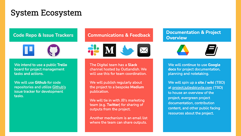 - Documentation & Project Overview — We will continue to use Google docs for project documentation, planning and notetaking. We will spin up a site / wiki (TBD) at project.juliesbicycle.com (TBD) to house an overview of the project, evergreen project documentation, contribution content, and other public facing resources about the project.