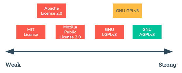 Software licenses are a bit more complicated than permissive licenses such as Creative Commons. In this area, where almost every codebase includes code from elsewhere, instead of the default ‘All Rights Reserved’ approach of copyright we use copyleft licenses. We recommended the GNU Affero General Public v3 (in green). This closes some loopholes and adds SaaS competitor protection — other organisations providing a service based on the codebase would have to release any modifications to the source code.