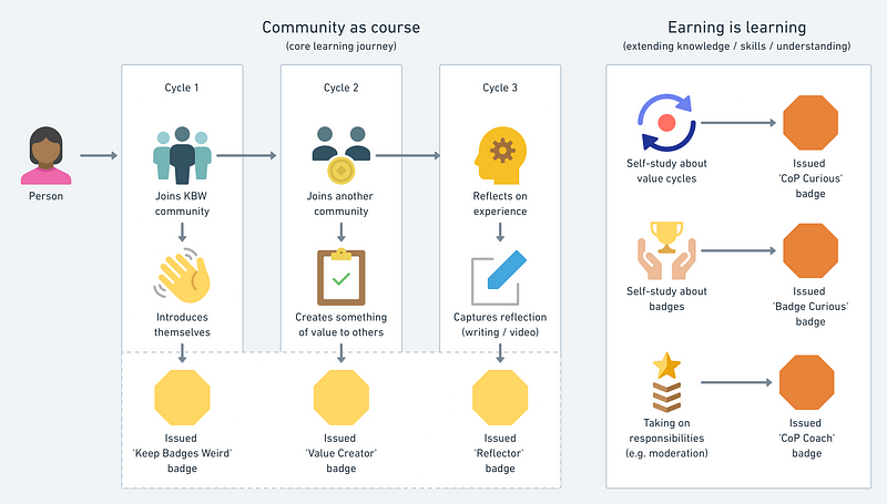 In this initial structure, we’ve designed badges that recognise the ‘value cycles’ that are central to Communities of Practice. So the badges for ‘Community as Course’ encourage participation, creating value for others, and reflecting on that experience.