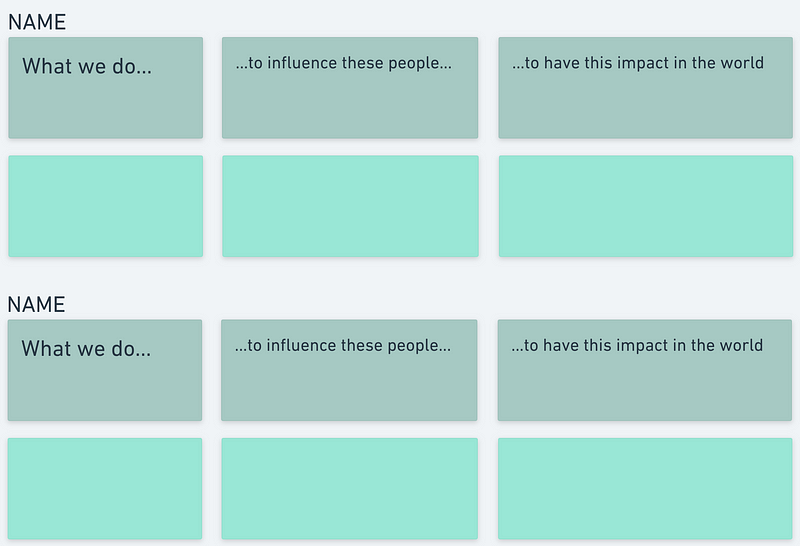 Next, we use the section to the right hand side where each individual participant can take some time to write down what they think the organisation does (or should) do, to influence their stakeholders, to have the desired impact in the world.