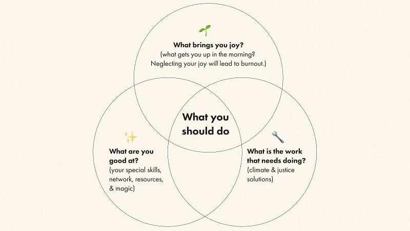 One tool we’ve found useful in thinking about this is the Venn diagram (shown below) shared by the How to Save a Planet podcast. At the centre of what we’re good at, what needs doing, and what brings us joy is the work that makes a difference.